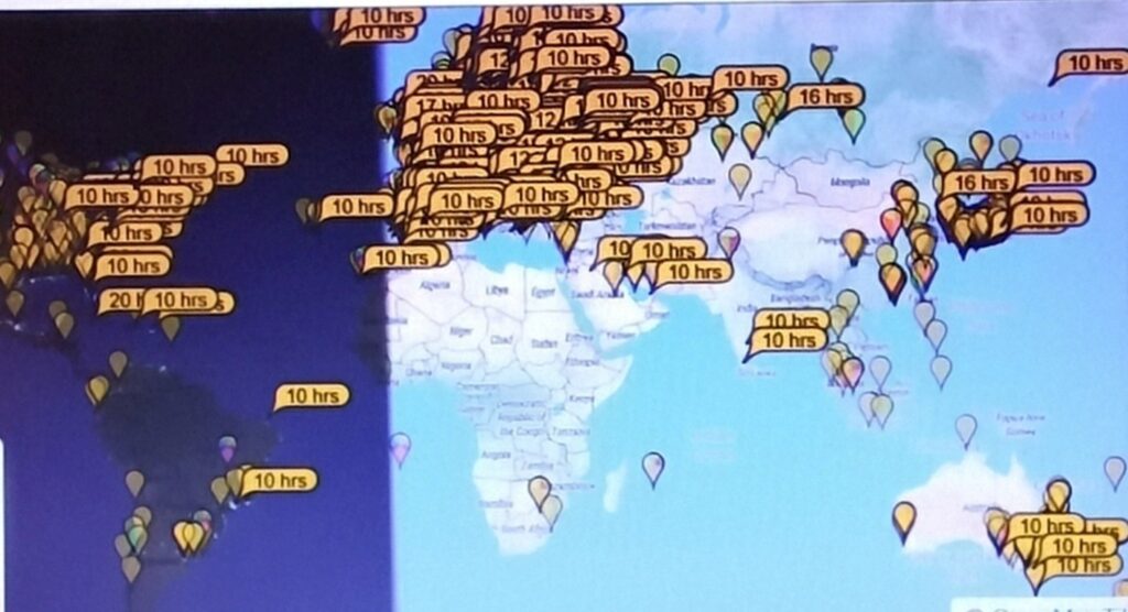 Een beeld van PSK REPORTER van vrijdagavond, 19 september. In FT8 met 50 WATT aangestraalde stations zijn te zien in ondermeer: EUROPA , INDIA, de USA, ZUID AMERIKA, OOSTELIJK RUSLAND, JAPAN, AUSTRALIË , TASMANIË (VK7ACE – 16951 km).