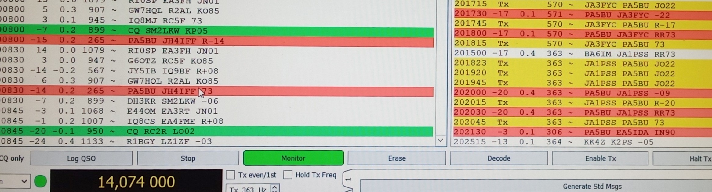 Uitgeweken naar 14.074 – FT8. Daar maakte ik tot mijn verbazing in 15 minuten met 50 WATT 3 QSO’S met JAPAN. AFSTAND tussen de 9100 en 9200 km. Zo werd het toch weer een leuke dag 🙂