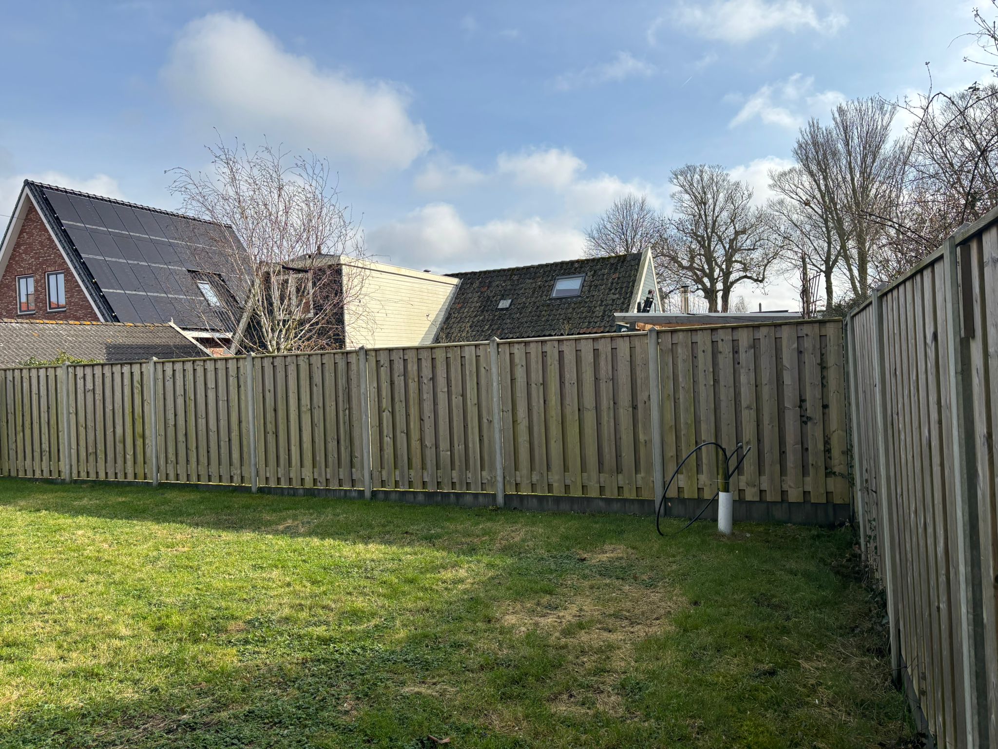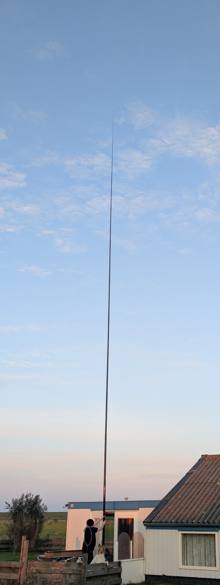 De meest linkse mast ruim 10 meter uitgeschoven en met touwtjes aan de schutting “gezekerd”.