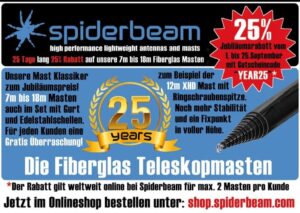 Mijn eigen avontuur met mastdelen (zie ook het stukje HIER of HIER) heeft een vervolg gekregen: Tijdelijk gaf Spiderbeam 25% korting vanwege hun 25 jarig bestaan. Hiervan heb ik gebruik gemaakt en ben nu de trotse bezitter van een Fiberglas Telescoopmast.