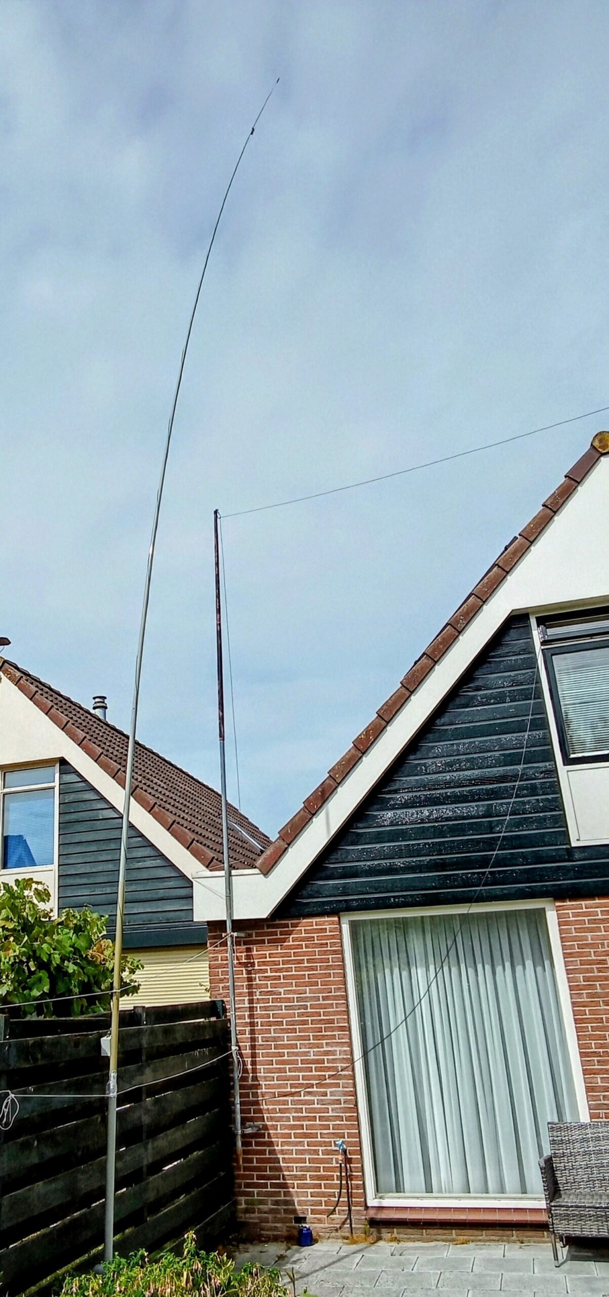 De meest linkse mast ruim 10 meter uitgeschoven en met touwtjes aan de schutting “gezekerd”.