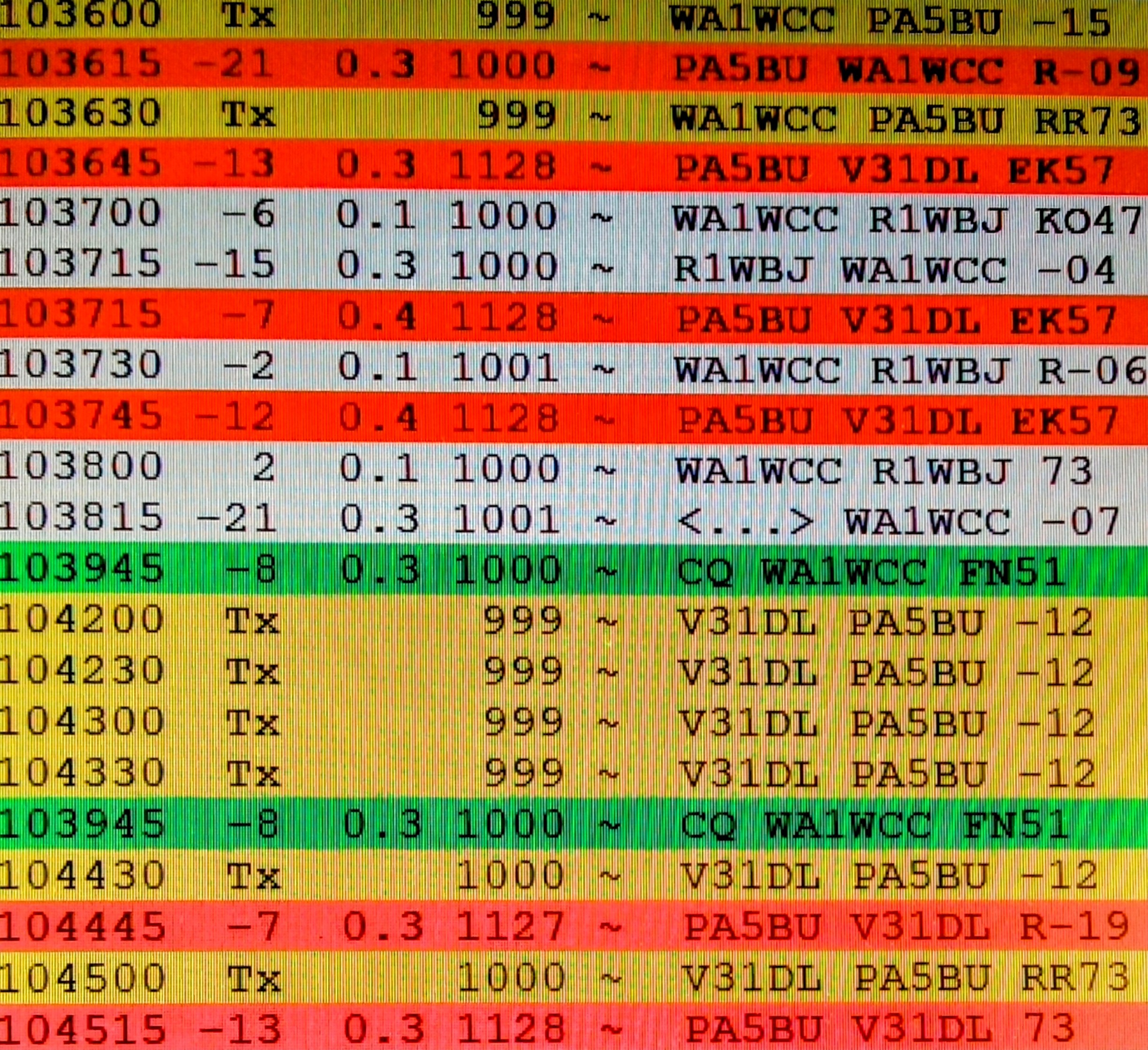 De antenne getuned en gekeken of ik een goede SWR had. Dat ging allemaal prima en vervolgens met 30 watt geprobeerd een 1e FT8 QSO te maken. Dat ging wonderwel goed. Het 1e QSO maakte ik met Edwin – WA1WCC in de USA. Een afstand van 5467 km. Het 2e QSO was helemaal bemoedigend. Dat was met ANDRE – V31DL in BELIZE, een staatje in Midden-Amerika en een afstand van 8714 km.