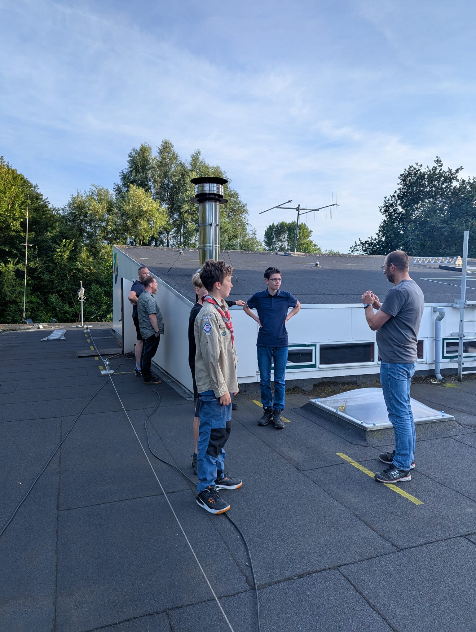 Afgelopen woensdagavond hebben zich 3 scouts gemeld voor de ZomerKampRonde. Om een indruk te geven van de apparatuur die bij radiocommunicatie nodig is, heb ik (Richard, PH2W) hier uitleg over gegeven.  Buiten op het dak zijn de diverse antennes bewonderd en hun eigenschappen verklaard. Uiteraard is er zorg gedragen voor de veiligheid van mens en kabels die men op het dak kan aantreffen.